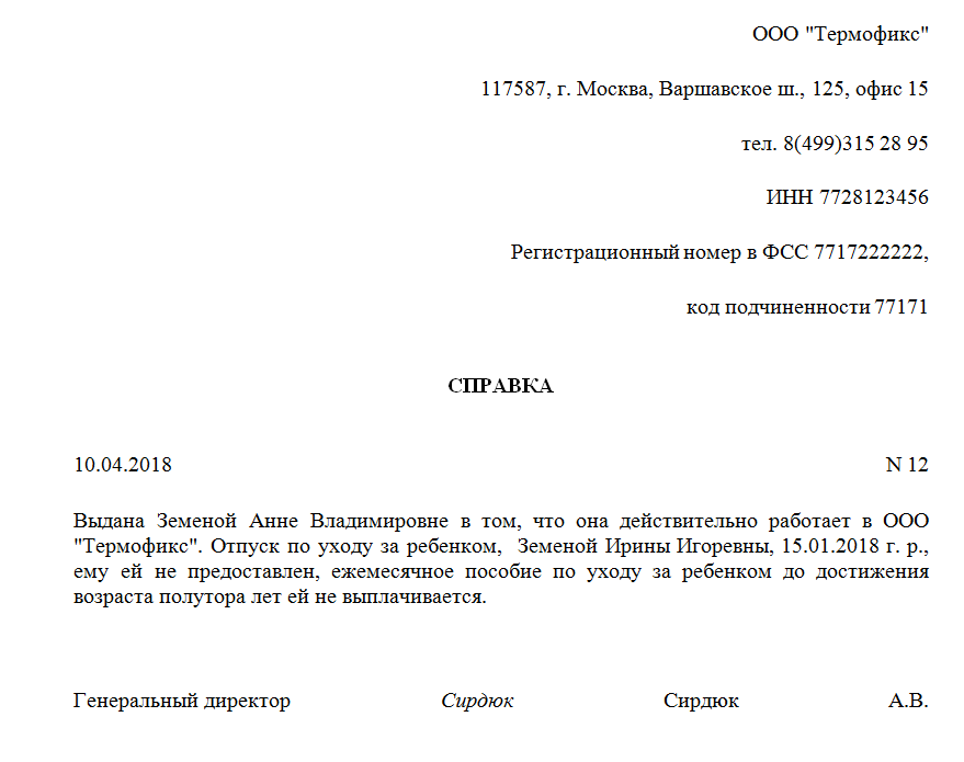 Для оформления пособия дополнительно нужна справка с места работающей матери о том, что такой отдых ей не предоставлен и доплат на малыша она не получает. Если мама не работает — справка из соцзащиты.