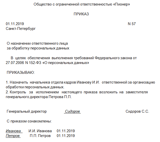 Приказом по предприятию ответственного сотрудника обязывают, например, обеспечивать сохранность информации на бумажных и электронных носителях, а также об осуществлении работниками их трудовых прав. Образец приказа о неразглашении персональных данных можно скачать в конце статьи.