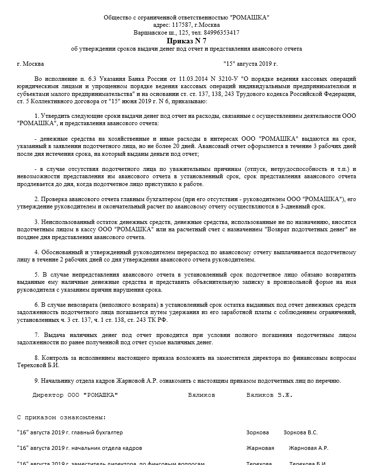 Деньги выдаются на ограниченный срок, по истечении которого работник должен предоставить авансовый отчет (далее — АО) с приложением документов, подтверждающих расходы. Ограничений такого срока нет. Как правило, его устанавливают в локальном акте.