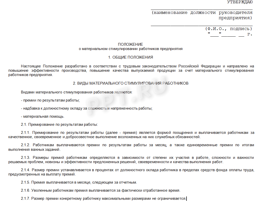 Положение о материальном стимулировании в организации