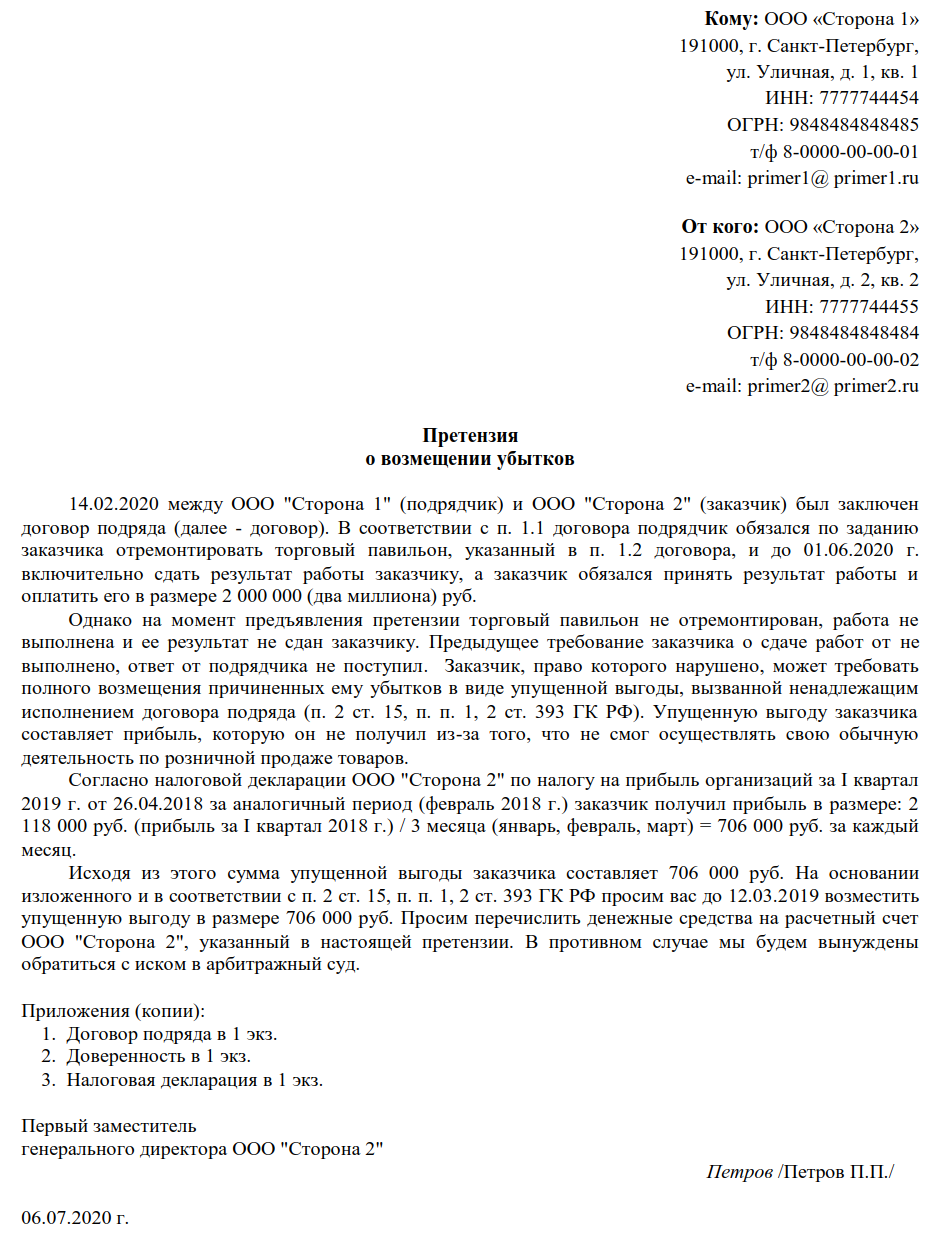 Претензия о возмещении ущерба — это письменное требование о компенсации неполученного дохода или поврежденного (утраченного) имущества.