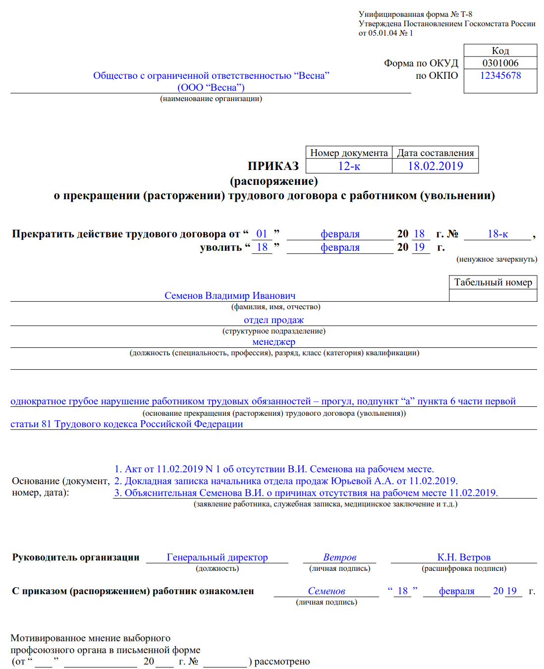 Приказ об увольнении за прогул — это внутренний распорядительный документ компании, который может быть составлен как в произвольной форме, так и с использованием унифицированной формы Т-8.