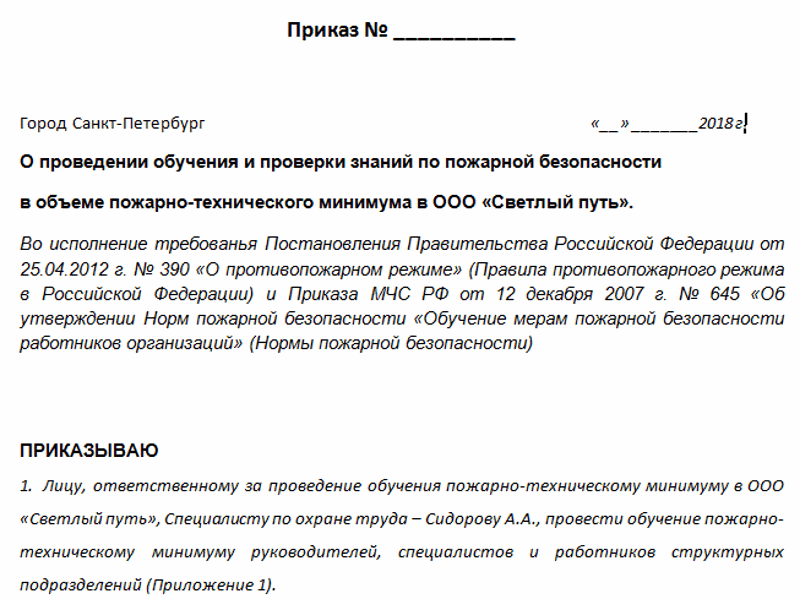 «Правила противопожарного режима в Российской Федерации», утвержденные Постановлением Правительства от 25.04.2012 № 390, распространяются на руководителей организаций и индивидуальных предпринимателей, в пользовании которых на законном основании находятся территории, здания, сооружения и прочие объекты. Согласно данному нормативному акту, работодатель может допустить персонал до работы на объекте только при подтверждении того, что работники обучены мерам пожарной безопасности. Порядок организации обучения изложен в «Нормах пожарной безопасности», утвержденных Приказом МЧС РФ от 12.12.2007 № 645. Документ предусматривает два вида подготовки: противопожарный инструктаж и пожарно-технический минимум.