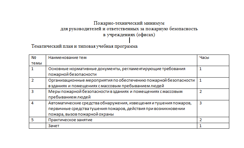 Программа обучения по пожарно-техническому минимуму зависит от специфики предприятия. Вот список обязательных тем (его перечень дан в Приложении 3 Приказа № 645):