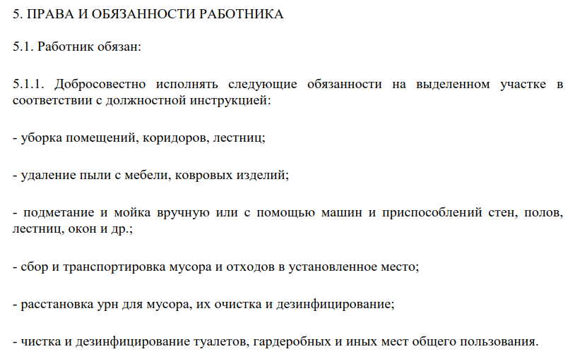 Важно точно описать сами трудовые обязанности уборщика в трудовом договоре во избежание дальнейших споров, вплоть до способов уборки и применяемых средств. Вот пример формулировок.
