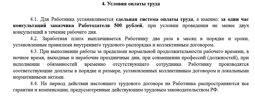Образец сдельной оплаты труда в трудовом договоре