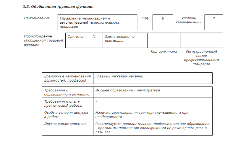 Сборник профстандартов по поиску «главный инженер» предоставляет перечень отраслевых должностей руководителей и специалистов. Название штатной позиции, трудовые функции и действия, требования к знаниям и умениям появляются при описании обобщенной трудовой функции — управление. Покажем на примере профстандарта 13.001 «Специалист в области механизации сельского хозяйства». С его помощью разрабатывают должностную инструкцию главного инженера в сельском хозяйстве по механизации.
