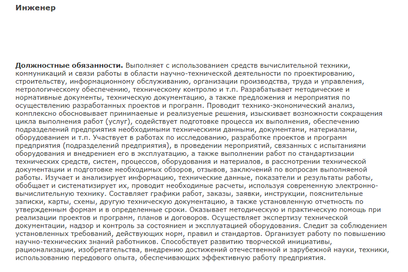 Раздел, описывающий должностные обязанности инженера ПТО, содержит конкретные трудовые действия, которые поручены инженеру ПТО на данном рабочем месте.