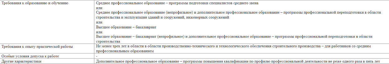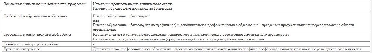 Должность работника отдела ПТО в строительстве описывается несколькими отраслевыми профстандартами. Один из них — профстандарт 16.032 «Специалист в области производственно-технического и технологического обеспечения строительного производства» — утв. приказом Министерства труда и социальной защиты Российской Федерации от 29.10.2020 № 760н. Название должностей в профстандарте 16.032: