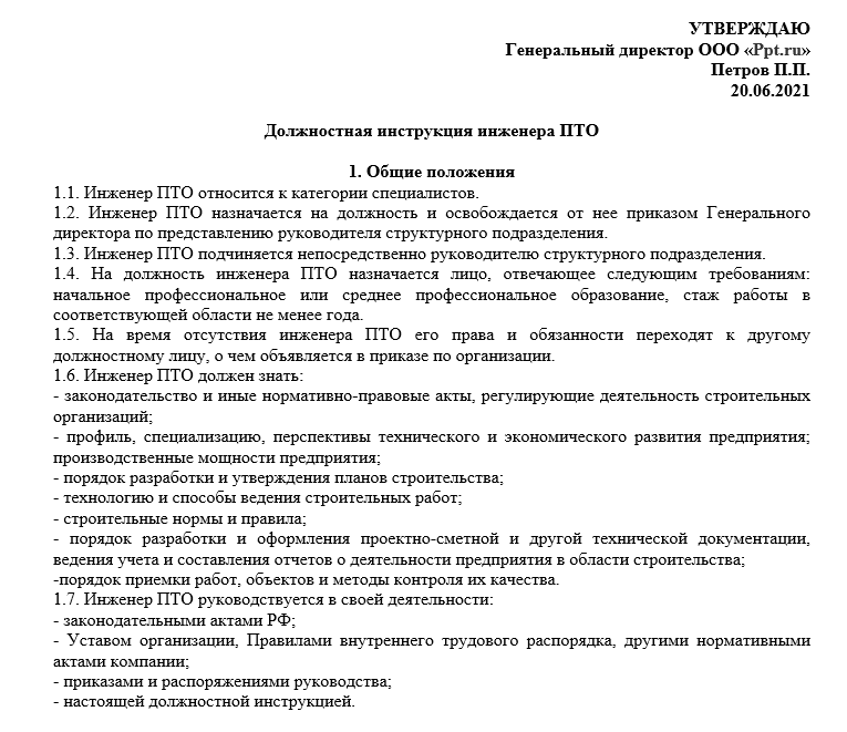 Образец должностной инструкции инженера ПТО на основе ЕКС выглядит традиционно.