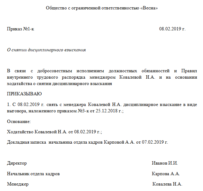 Образец приказа о снятии взыскания