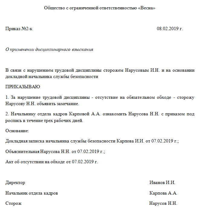Образец приказа о вынесении дисциплинарного взыскания