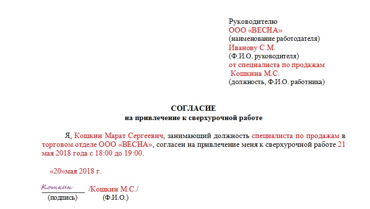 Порядок составления и образец согласия на сверхурочную работу