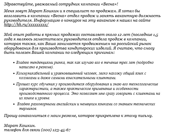 Полный образец сопроводительного письма к резюме (пример hh.ru) может выглядеть так: