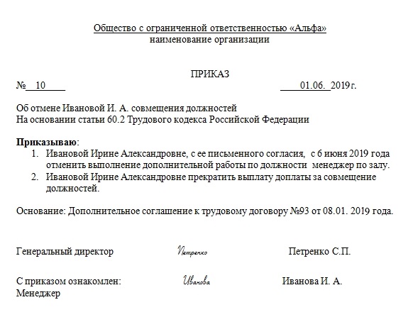 Образец приказа о снятии совмещения должностей представлен ниже.
