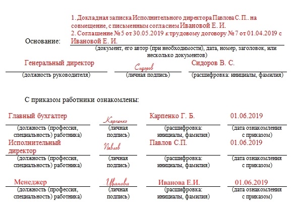 На последнем этапе издается приказ. В каждой организации разрабатывается свой образец приказа о совмещении должностей - унифицированная форма этого документа законодательством не утверждена. Его образец представлен ниже.