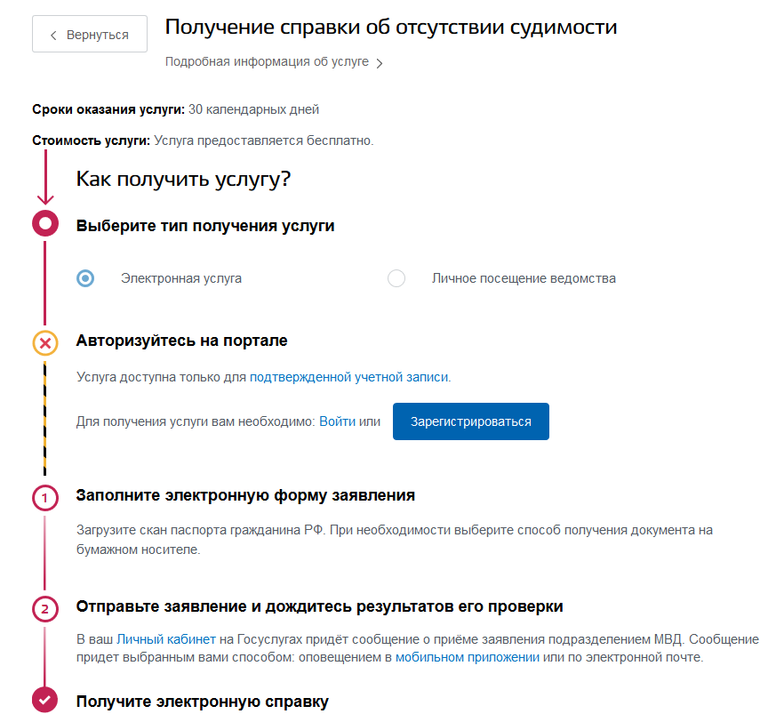 Обратите внимание: срок изготовления — 30 дней, так что если вы беспокоитесь о том, как быстро получить справку об отсутствии судимости, этот вариант не является предпочтительным (срок не зависит от того, вы выбрали электронную услугу или личное посещение ведомства).