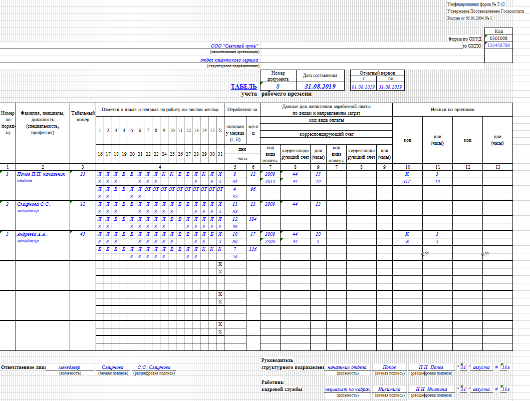 После заполнения табель передается для ознакомления руководителю, а затем расчетной группе для начисления заработной платы согласно отработанной норме. Чаще всего записи для сохранности создаются и в бумажном, и в электронном видах.