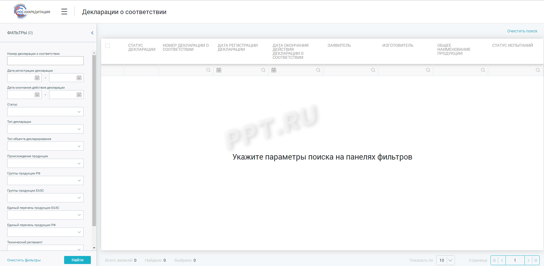 Размещенный на сайте реестр деклараций соответствия Таможенного союза позволяет осуществлять поиск не только по номеру бумаги, но и по типу продукции, заявителю, изготовителю, дате выдачи и сроку действия.