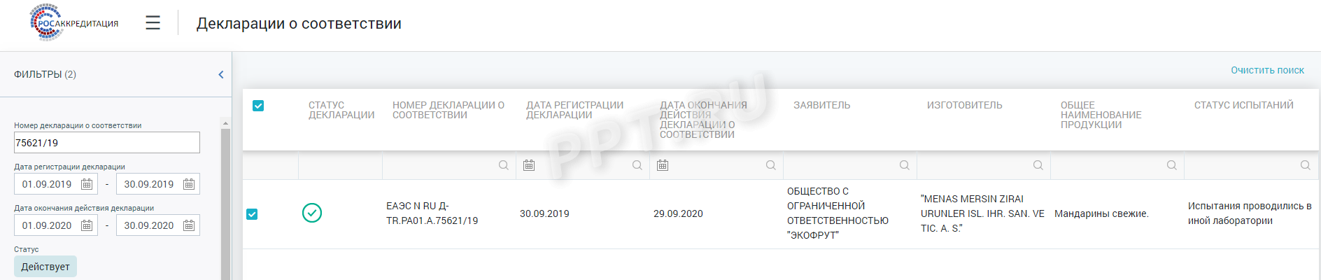 Нажав на кнопку «Поиск» или клавишу Enter, вы сможете проверить декларацию о соответствии таможенного союза и ЕАЭС.