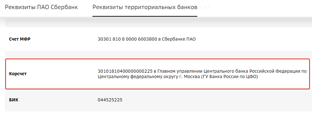 Самый очевидный путь — посмотреть на сайте банковской организации: корреспондентский счет банка указан в разделе «Реквизиты». Вот так, например, представлена информация на сайте Сбербанка.