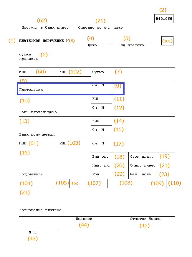 Информацию о р/с всегда указывают в договорах и при заполнении платежных поручений. Этот уникальный код, который тоже состоит из 20 цифр, вписывают в поле 9 (см. картинку).