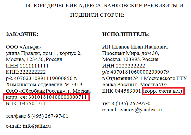 На картинке представлен образец договора между организацией и ИП. Пример показывает, как выглядит корреспондентский счет банка: это последовательность из 20 цифр.