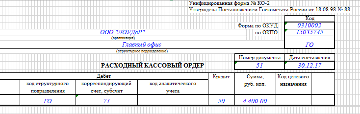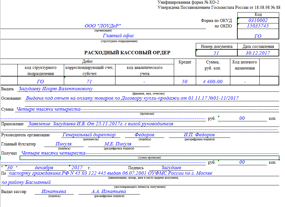 Образец заполнения расходного кассового ордера в подотчет
