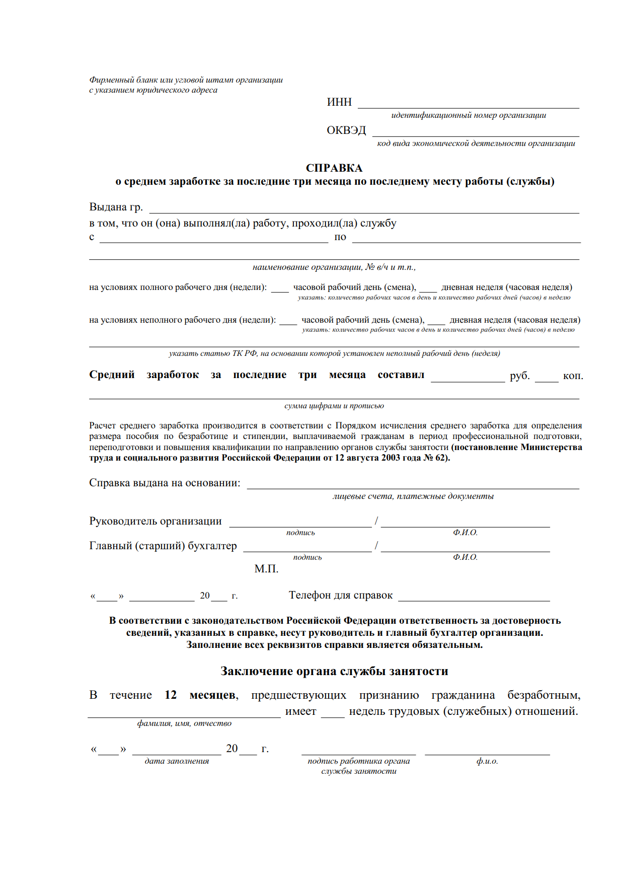 Если указанная справка составлена работодателем в произвольной форме и содержит сведения, необходимые для подбора подходящей работы, а в случае признания гражданина безработным — для определения размера и сроков выплаты пособия по безработице, основания для отказа в ее принятии отсутствуют.