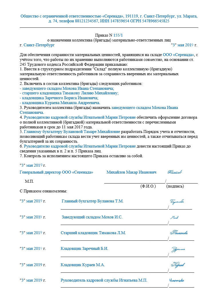 Одним распоряжением руководитель может возложить ответственность за хранение материальных ценностей сразу на группу лиц. Важно, что согласно ст. 245 ТК РФ, без письменного договора о полной коллективной материальной ответственности, который заключается между работодателем и всеми членами бригады, документ не может иметь юридической силы. Приведём пример: