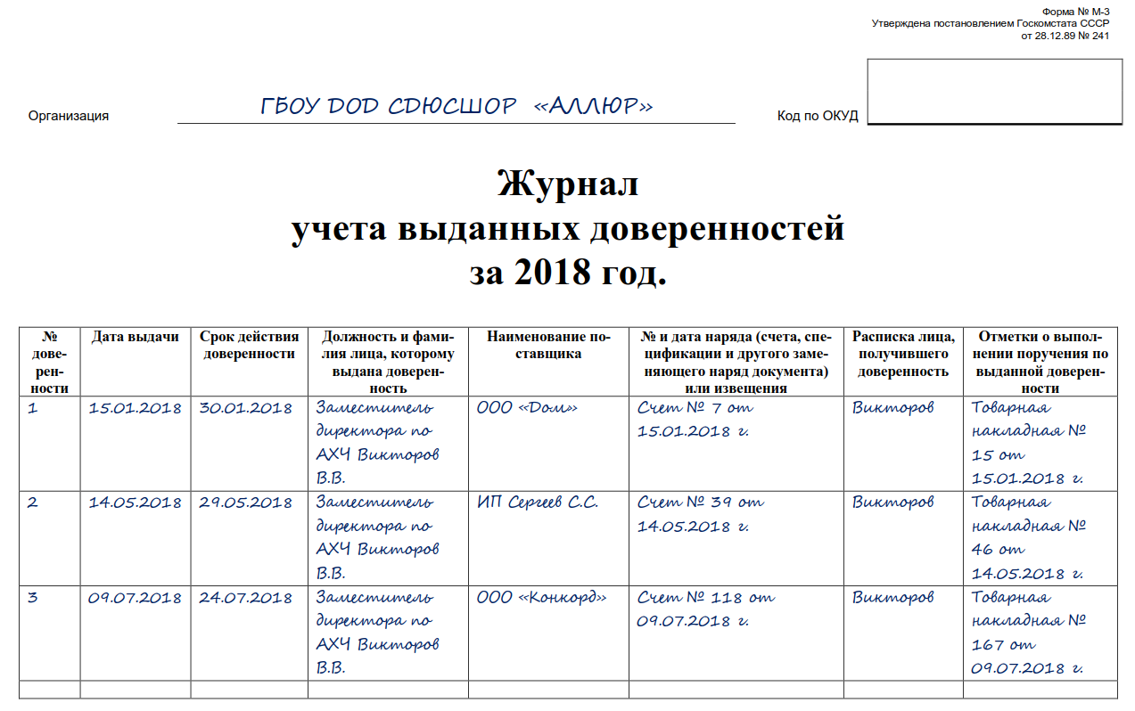 Журнал учета выданных доверенностей форма М-3 необходим для учета выданных доверительных документов и для подтверждения факта их получения. Например, работа с товарно-материальными ценностями или же определенными документами у контролирующих органов всегда требует выдать сотруднику соответствующий документ.