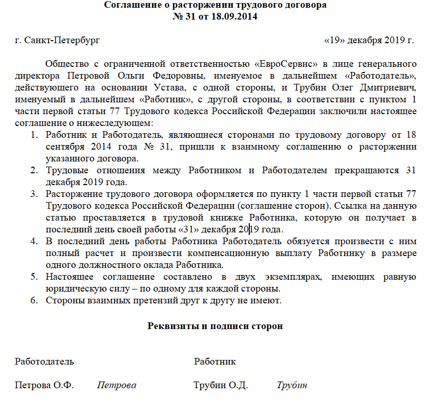 Скачать образец соглашения о расторжении трудового договора