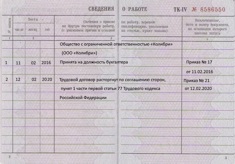 Точная формулировка в трудовой книжке при увольнении по этому основанию: «Трудовой договор прекращен по соглашению сторон, пункт 1 части первой статьи 77 Трудового кодекса Российской Федерации». Вместо «трудовой договор прекращен» допускается написать «уволен».