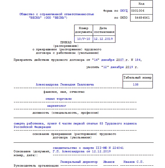 Эти бумаги могут принести в организацию родственники покойного, либо руководство может получить их самостоятельно, если работник был одиноким. После этого необходимо издать приказ об увольнении в связи со смертью. (ст. 84.1 ТК РФ). Для этого можно использовать унифицированную форму Т-8, утвержденную постановлением Госкомстата России от 05.01.2004 № 1, или разработать этот документ самостоятельно. Выглядеть приказ об увольнении будет так:
