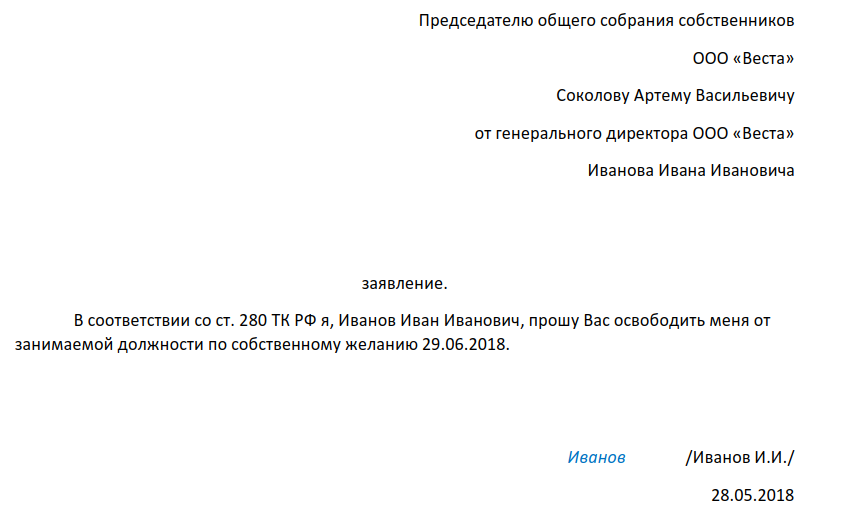 - 1 месяца при замещении должности уровня топ-менеджера (заявление на увольнение генерального директора ООО, образец которого можно скачать в конце статьи, составляется также по общим правилам).