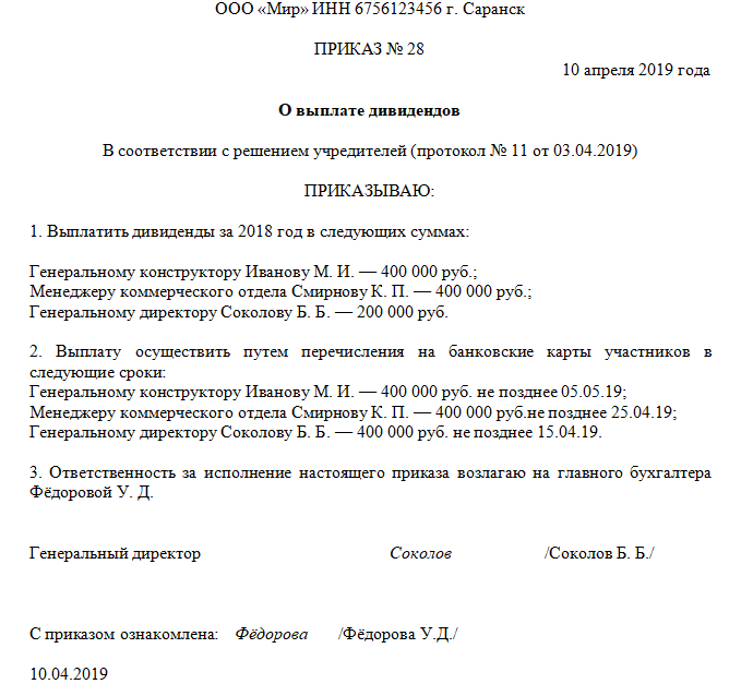 Порядок выплаты дивидендов единственному учредителю в ООО не имеет каких-либо особенностей и оформляется таким же решением учредителя о выплате дивидендов, только в единственном лице. Приказ о выплате дивидендов единственному учредителю (образец) отвечает на вопрос, кому именно они выплачиваются, какая сумма денег подлежит перечислению и каким образом их будут передавать.