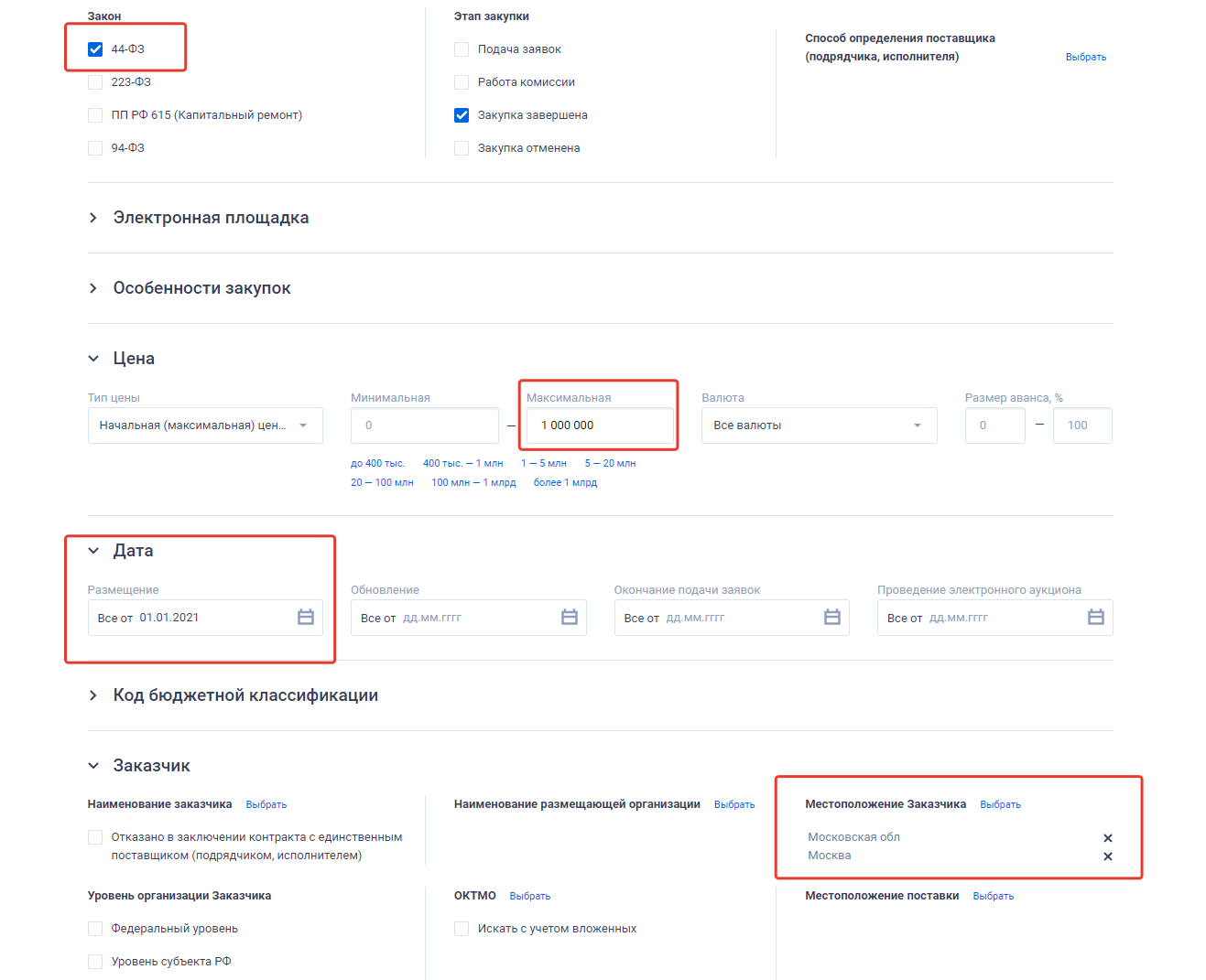 На странице с записями есть ссылка для перехода ко всем параметрам поиска. Эти фильтры помогают отсечь госзакупки, которые не нужны, и провести детальную проверку. Разберем, какие параметры настраиваются обязательно.