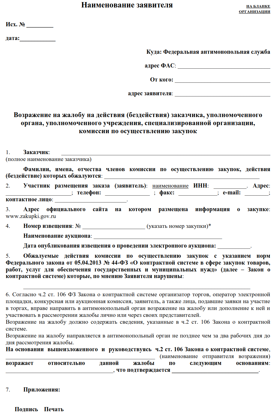 Возражение на жалобу направляется в антимонопольный орган — Федеральную антимонопольную службу. При формировании заявления заказчик должен учесть требования по содержательной части документа, указанные в ч. 2 ст. 106 44-ФЗ. Ответ на претензию от заказчика составляется на фирменном бланке организации-заявителя и в обязательном порядке должен включать следующую информацию: