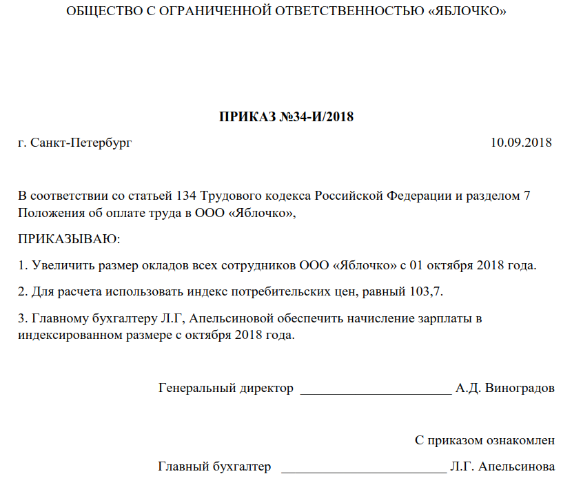 В приказе следует отразить законодательные нормы, применяемый индекс и ответственное лицо. С этим документом необходимо ознакомить всех сотрудников.