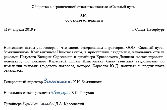 Бывают случаи, когда сотрудник не принимает само уведомление. Почтой насильно его не вручить. Через 30 дней письмо вернется обратно в организацию. Но если сотрудник все же появляется на рабочем месте, можно проинформировать его принудительно. При этом следует составить акт об отказе поставить подпись, собрать двоих свидетелей и зачитать документ вслух.