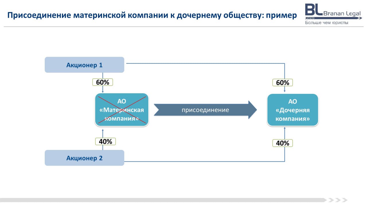 Разберем на примере ключевые аспекты присоединения материнской компании к дочернему обществу (АО).