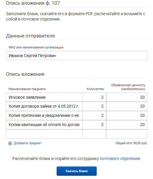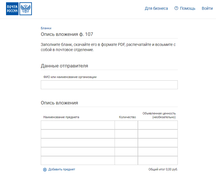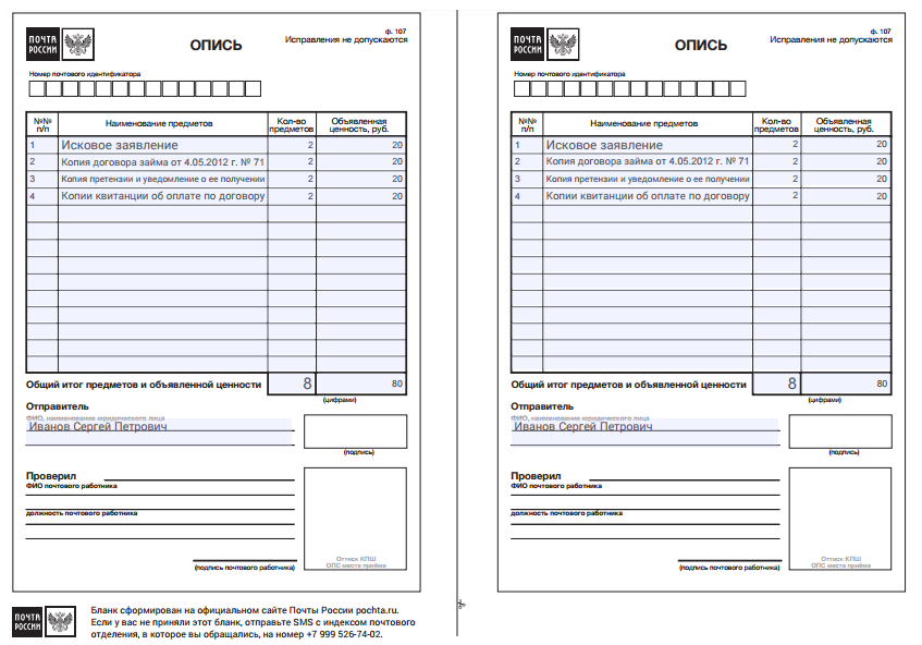 Однако с точки зрения экономии времени первый способ — заполнить онлайн бланк описи вложения (ф 107, бланк) — лучше. Потому что в отделение необходимо принести два одинаковых списка: один останется у отправителя, а другой вышлют адресату. Если вы заполняете перечень вручную, то придется дублировать записи. А когда вы заполняете список на сайте, то при скачивании для дальнейшей печати получаете два совершенно одинаковых перечня, которые останется только подписать.