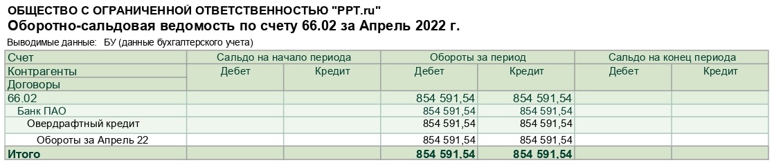 Обороты за период отражают информацию, сколько компания привлекла заемных средств и сколько погасила. На вопрос, что выбрать: 66.01 или 66.02 — ответим: если у вашей компании имеется процентный заем, то используем их в паре. На 66.01 отразим основную сумму задолженности банку, например по овердрафту, а на 66.02 соберем информацию о начисленных и уплаченных процентах. На конец периода кредит счета 66 показывает сумму задолженности банку: 87 940 799,63 рублей. На 66.02 в апреле ООО «NashGlavbuh.org» начислено и уплачено процентов на сумму 895 303,65 рублей.
