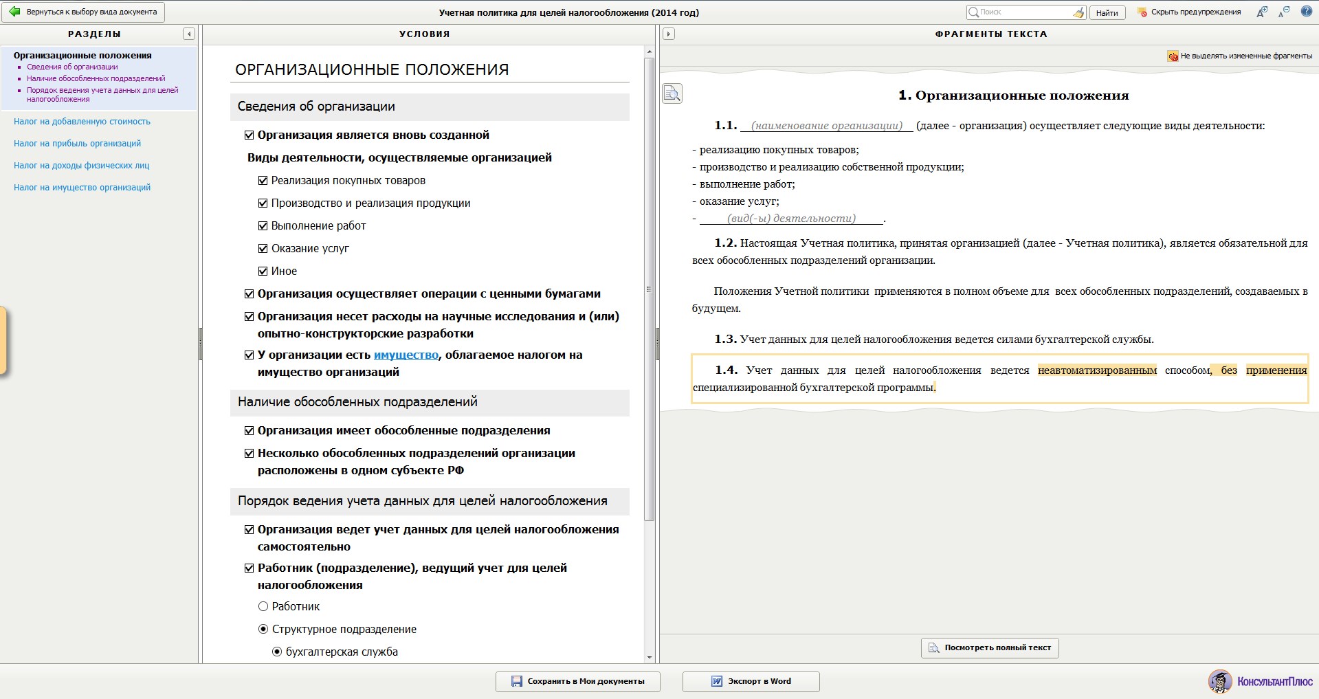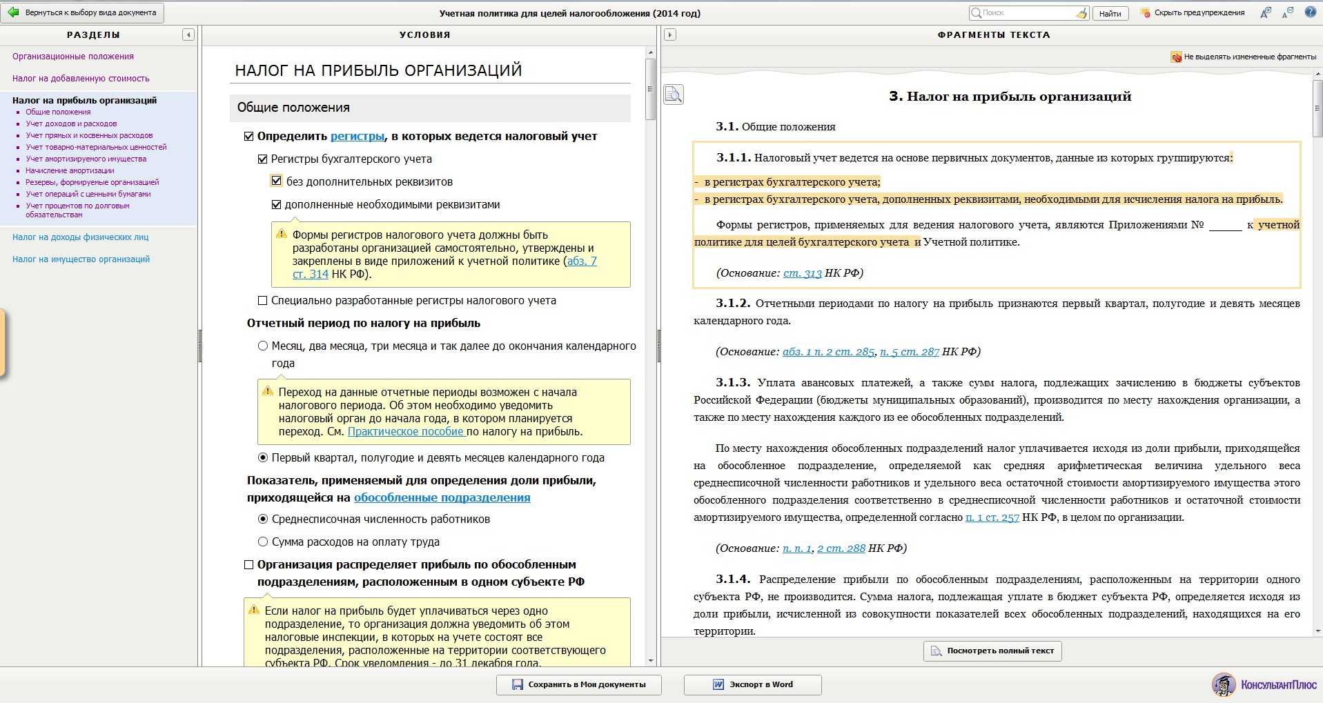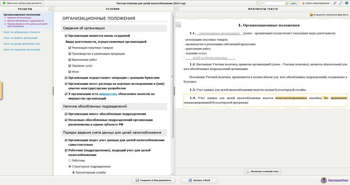 В «налоговой» учётной политике определяется порядок организации учёта и документооборота по операциям, связанным с формированием величины налогооблагаемых баз, совокупность допускаемых НК РФ способов (методов) определения доходов и (или) расходов, их признания, оценки и распределения, а также учёта иных необходимых для целей налогообложения показателей финансово-хозяйственной деятельности налогоплательщика. Рассмотрим основные моменты, которые должны быть раскрыты при формировании учётной политики для целей налогового учёта. Давая рекомендации, мы будем использовать алгоритмы, предлагаемые программой Конструктор учётной политики на 2016 год, представляемой правовой системой «Консультант Плюс».