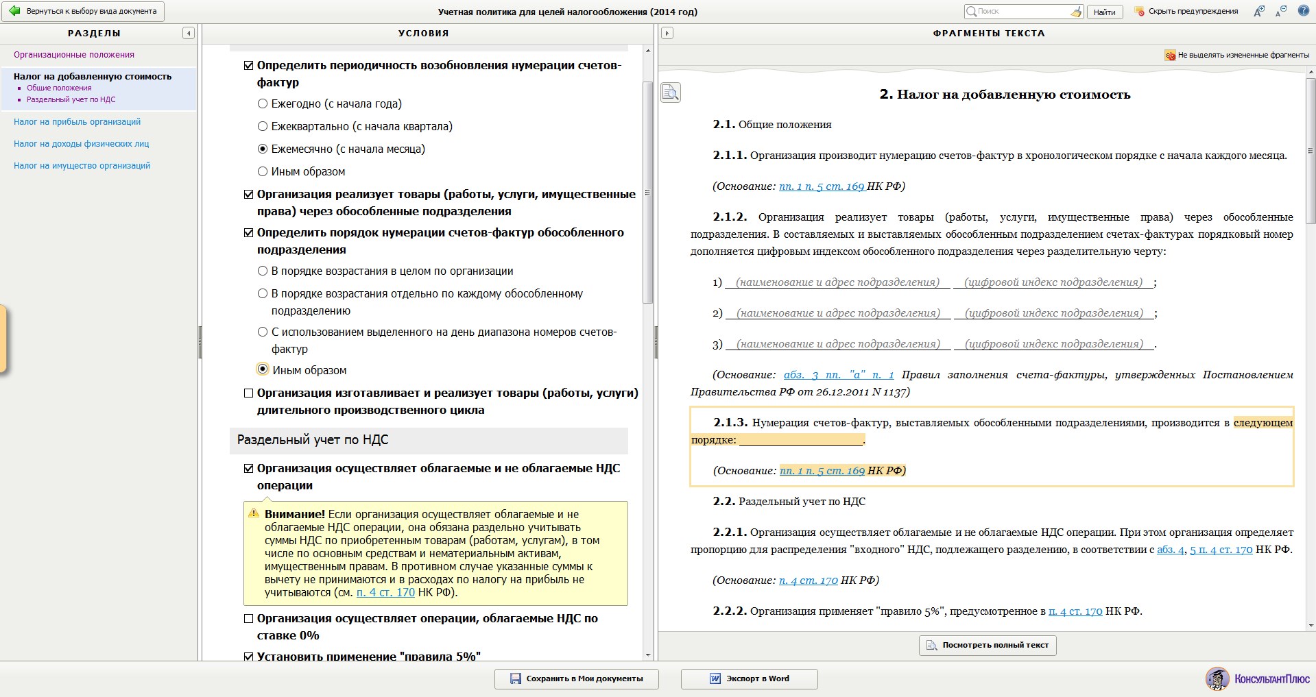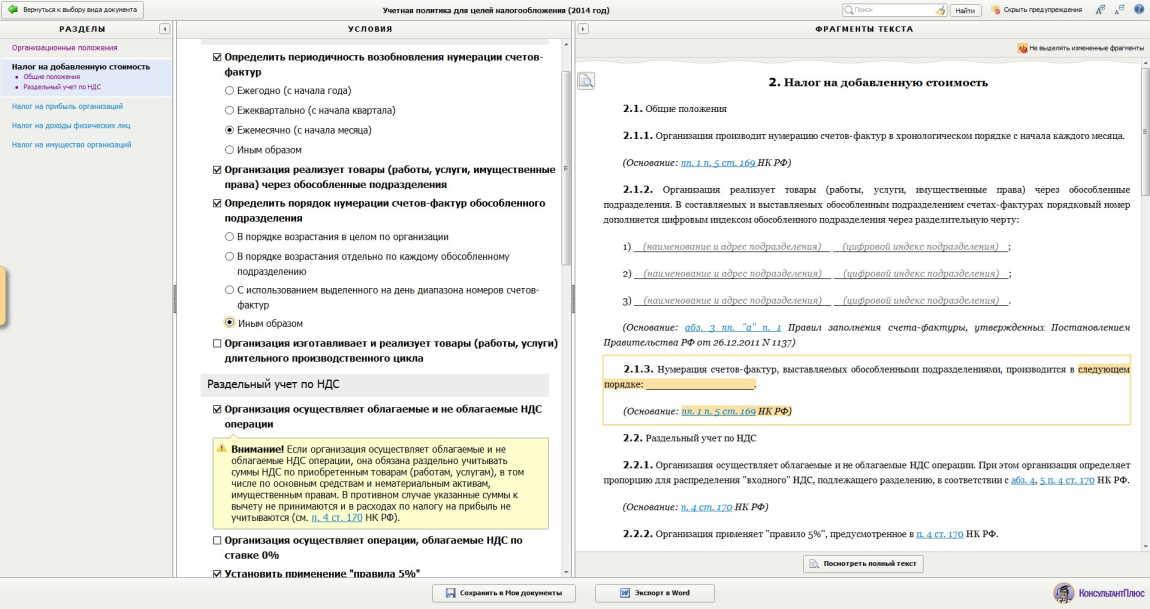 Данный раздел заполняют только организации, являющиеся плательщиками НДС. В рамках общих положений по порядку ведения налогового учёта НДС организация должна указать периодичность возобновления нумерации счетов-фактур. Жёсткого ограничения в нормативных и законодательных актах по данному вопросу нет, поэтому организация вправе указать любой из предлагаемых вариантов - ежемесячно, ежеквартально, ежегодно, с иной периодичностью. Организации, занимающиеся изготовлением (производством) товаров, работ и услуг с длительным производственным циклом (более 6 месяцев, согласно перечню, утверждённому Правительством РФ), должны предусмотреть в учётной политике момент определения налоговой базы при получении предоплаты в счёт предстоящих поставок товаров (выполнения работ, оказания услуг). Этот момент может признаваться как общим по всем операциям, так и раздельным (индивидуальным).