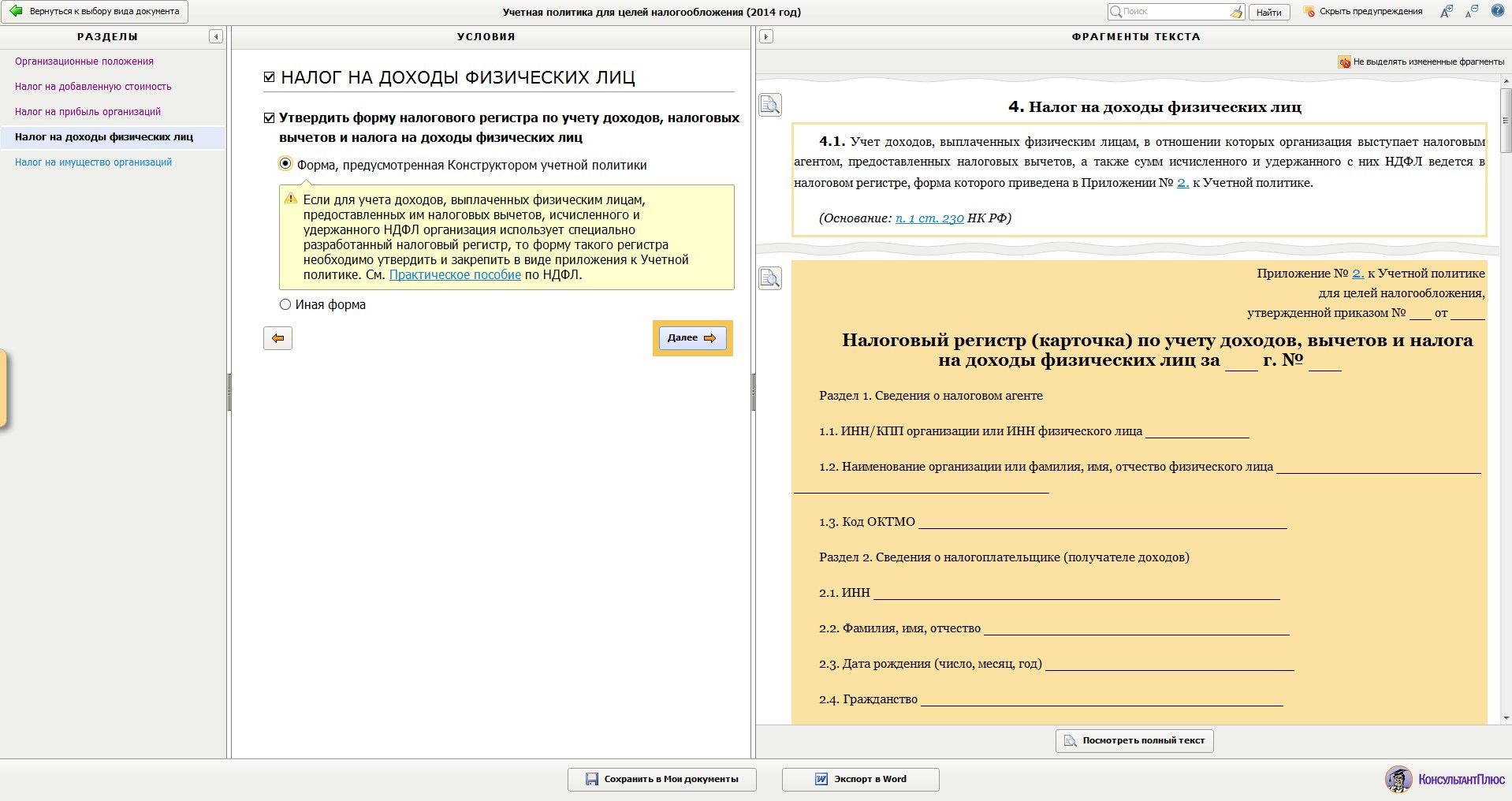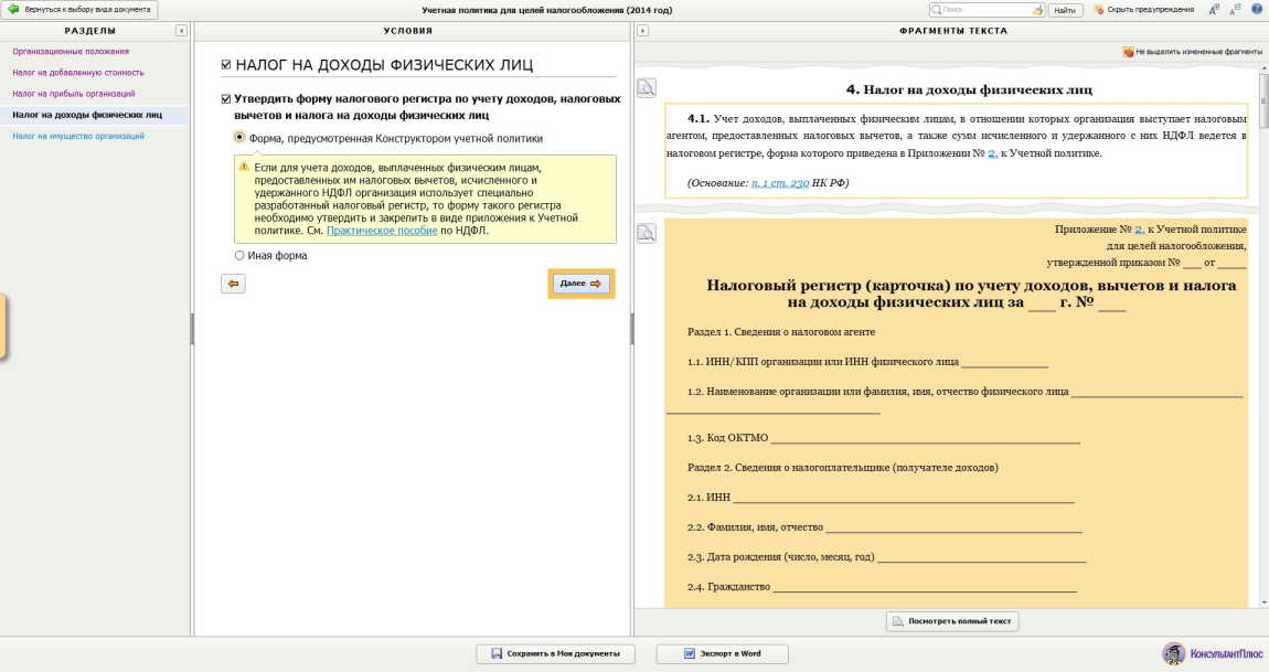 В отношении данного налога организации требуется в учётной политике только указать форму налогового регистра по учёту начислений и удержаний по доходам физического лица, в отношении которого организация выступает в качестве налогового агента. Данный момент необходим к раскрытию, так как унифицированные формы налоговых регистров по НДФЛ отсутствуют и организация должна утвердить их самостоятельно.