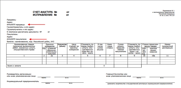 КПП — это один из способов идентификации предприятия и его структурных единиц. Он традиционно используется в качестве одного из реквизитов при оформлении бланков, договоров, доверенностей и других документов. Кроме того, этот признак ОП используется в счете-фактуре. Бланк счета-фактуры содержит поля для указания кода продавца и покупателя, место указания КПП обособленного подразделения в счет-фактуре отмечено красными стрелками.