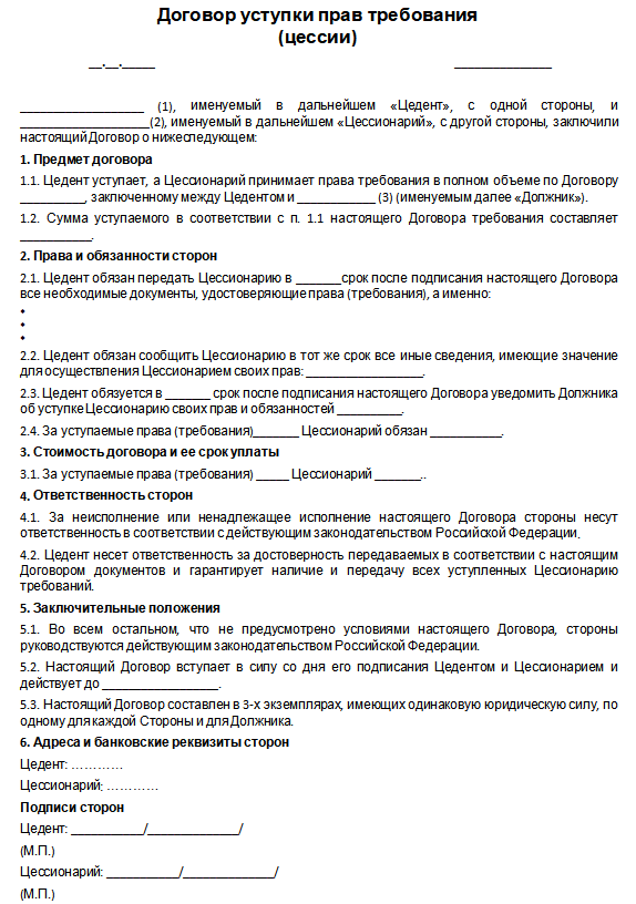 Договор уступки прав требования — документ, в котором закрепляют взаимоотношения цедента и цессионария и условия цессии.
