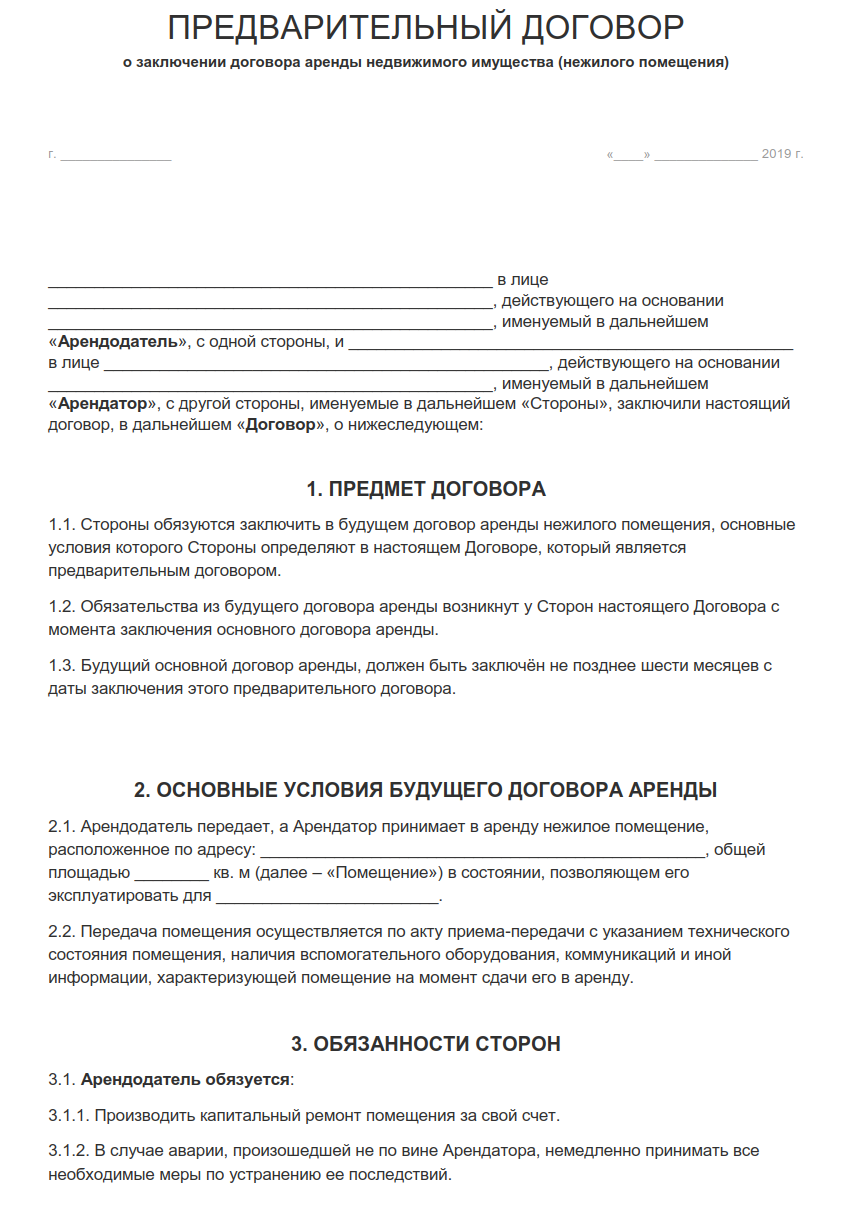 Образец предварительного договора на нежилое помещение