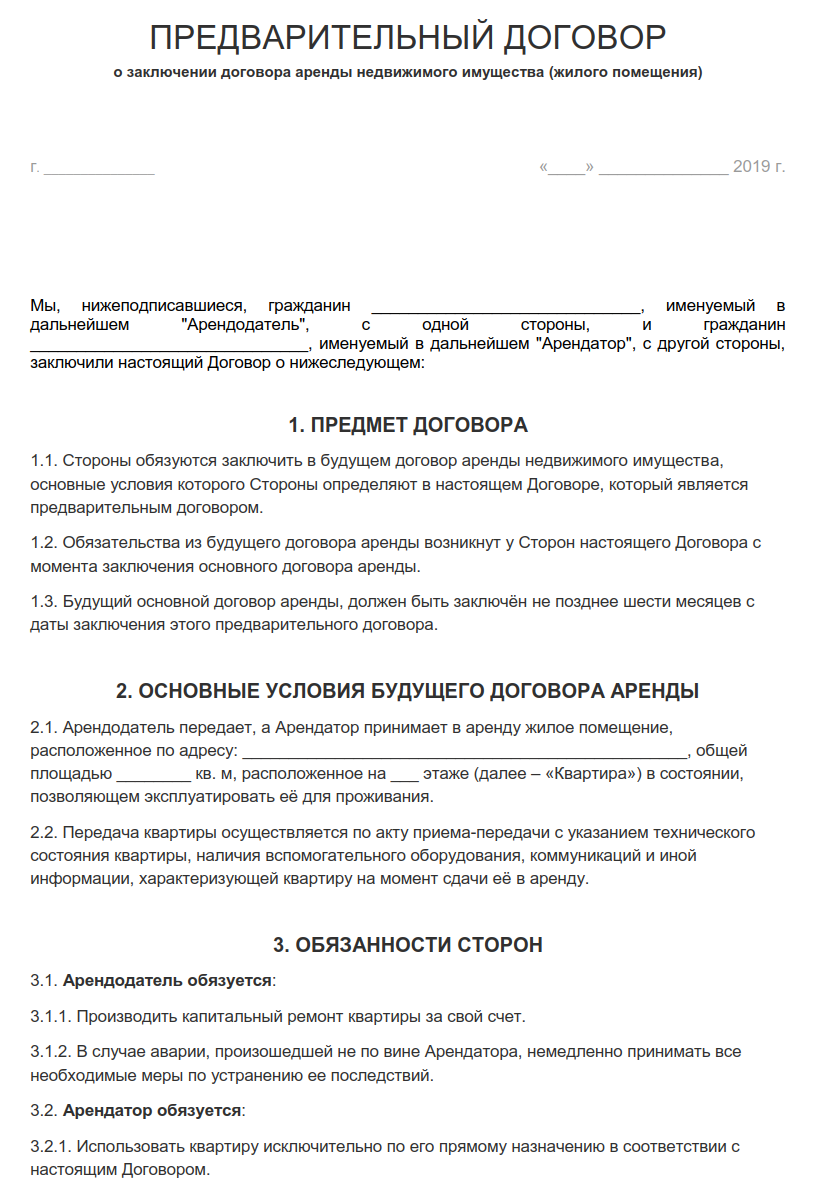 Образец предварительного договора аренды жилого помещения